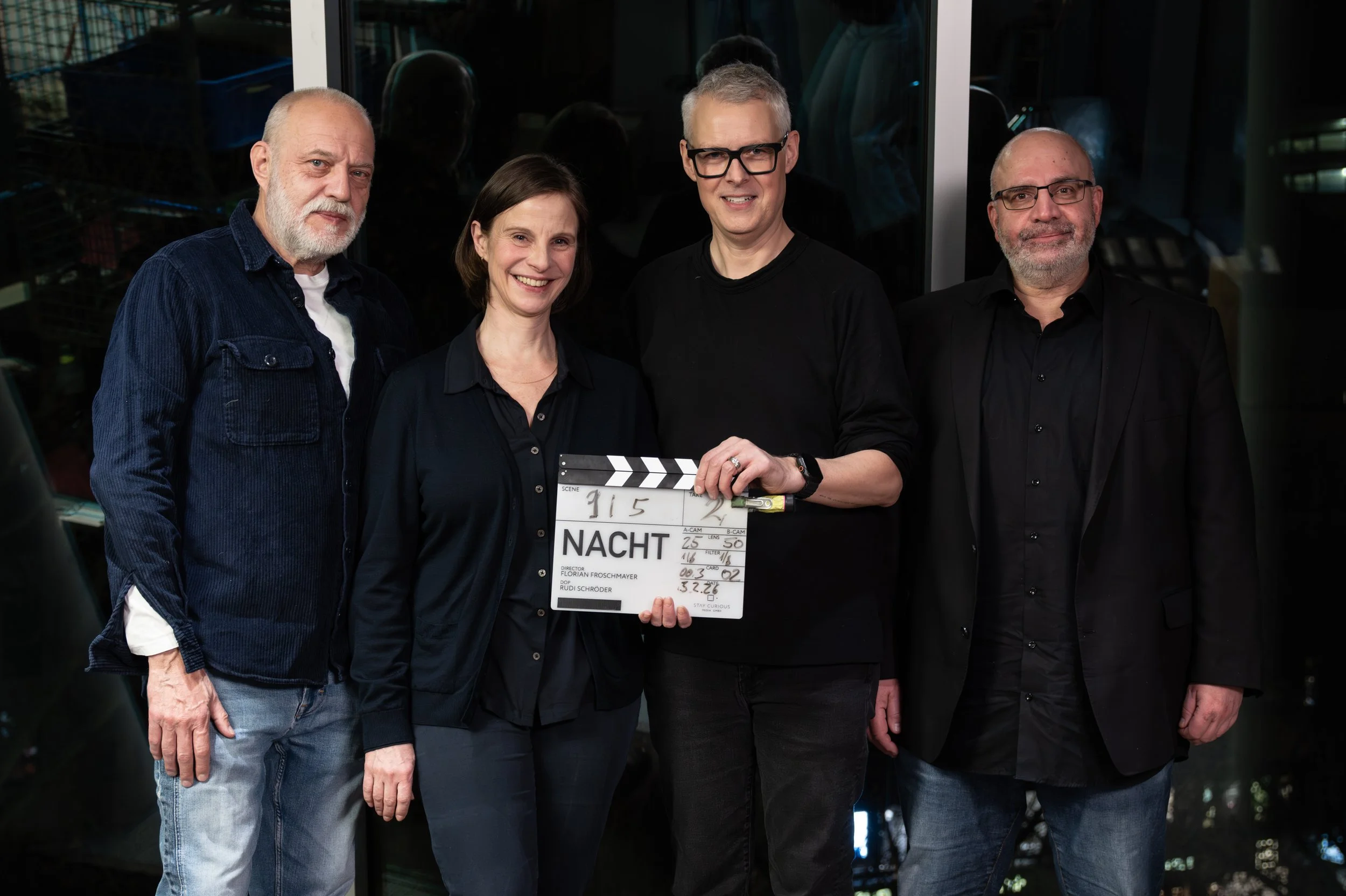 NACHT is an independently produced feature film by Florian Froschmayer, realized with an experienced team of long-time collaborators. Cinematography is by Rudi Schröder, production design by Jost Brand Hübner, costume design by Manuela Nierzwicki, and makeup by Kim Epes. The original score is composed by Rainer Oleak, with original songs by Steven Eli. Sound design is by Peter Staubli (Skyfall, The Bourne Ultimatum). Additional cast members include Oliver Mommsen, Lea Freund, Carina Wiese, Natascha Weintzendorf, Leonardo Can, as well as Victoria Sturm and Tilo Schmitz (voices).